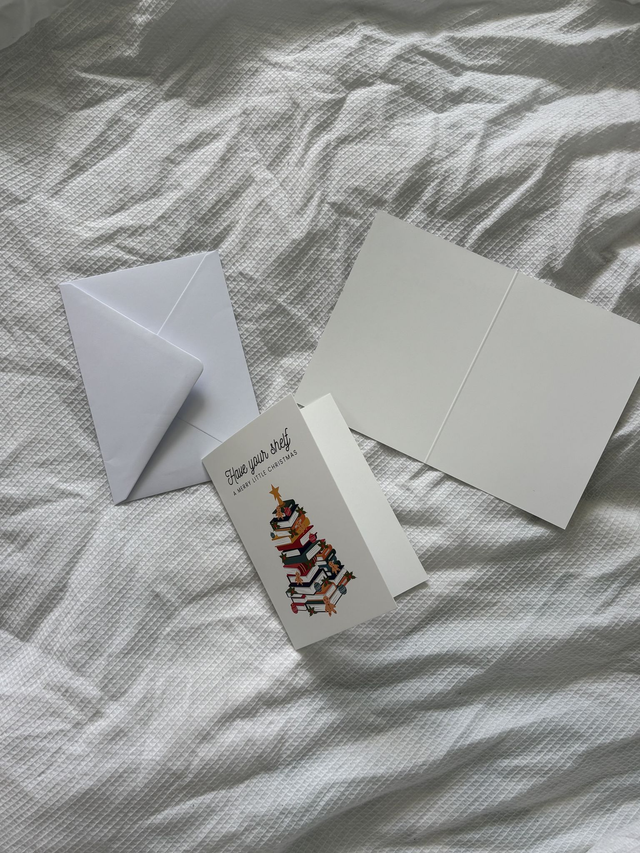 Celebrate the holiday season with our unique bookish Christmas card featuring the charming message, "Have Your Shelf a Merry Little Christmas". This fun and festive card is perfect for book lovers and avid readers alike. The blank inside allows for a personalized message, while the included envelope makes it easy to send to loved ones near and far. Spread holiday cheer with this adorable card that is sure to bring a smile to any bibliophile's face. Shop now and make this Christmas season a literary one to remember!