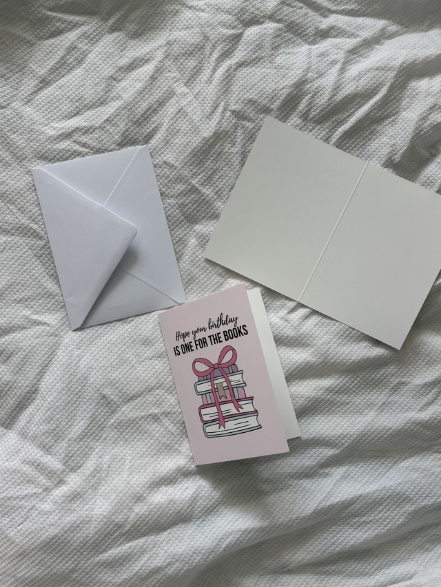 Celebrate a book lover's birthday with our charming birthday card featuring the message, "Hope your birthday is one for the books." This whimsical card showcases a stack of books tied with a bow against a lovely pale pink background. The perfect combination of sweet sentiment and literary flair, this card is sure to make any recipient feel special on their special day. Ideal for bookworms of all ages, this adorable card adds a touch of literary charm to any birthday celebration. Make your loved one's birthday memorable with this unique and thoughtful greeting card.